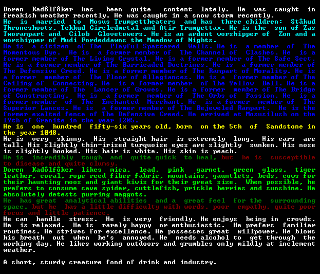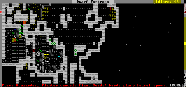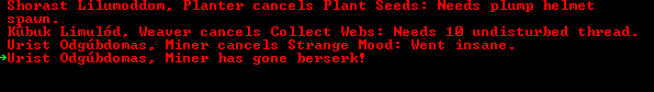 The wall is completed while Urist just sits there, clutching her infant child in one hand and her pick in the other, screaming out "I must have yarn cloth! I must have rock! I must have cut gems! I must have metal bars!"