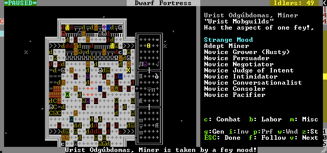 While the vampires get to work at whatever it is they're doing, Urist Mobguilds, an adept miner, is taken with a strange mood.