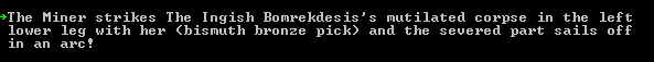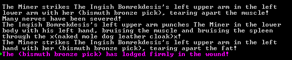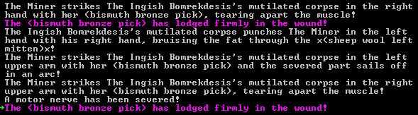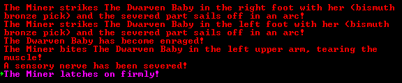In a heartbeat, Urist's mind snaps. She severs the infant's feet with her bismuth bronze pick. Furious, the baby howls in rage just as the mother's teeth close around its left upper arm. Mercifully, the infant dies there, and not after a more prolonged assault.