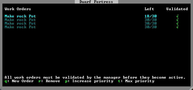 I see no need to endanger dwarven lives by bringing down justice upon them. I order some rock crafts to be made, and put them at the front of the queue. The rock pots are there so that I can be sure I won't ever run out of alcohol.